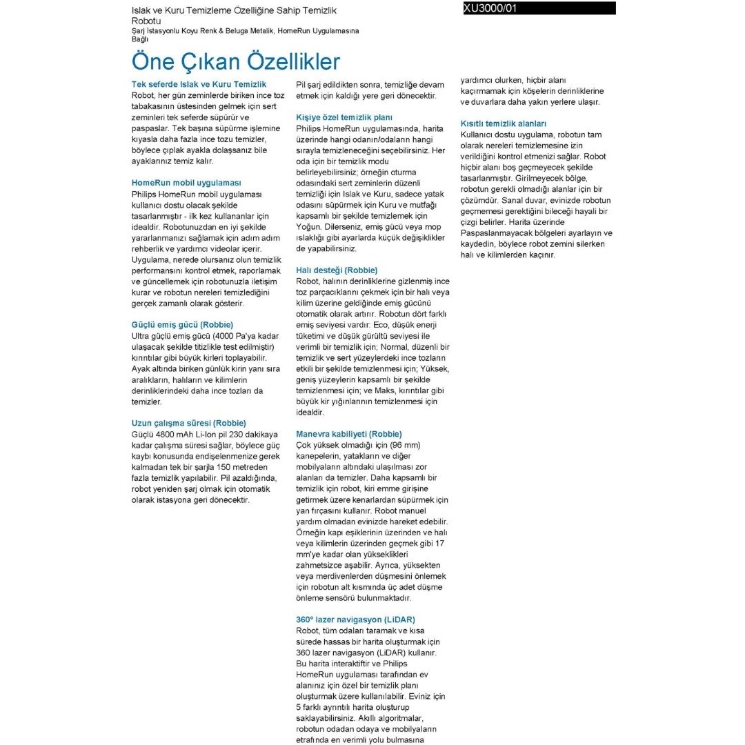 Philips HomeRun 3000 Serisi Aqua XU3000/01 Siyah Akıllı Robot Süpürge Özellikleri